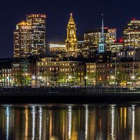 Een charmante indruk uit Boston - de verlichte skyline van North End met de Custom House Tower en de top van de Old North Church. De twee historische gebouwen steken af tegen de moderne skyline. Een indrukwekkende avondsfeer uit de hoofdstad van de staat Massachusetts.