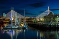 Een betoverend uitzicht op Boston - de verlichte Bunker Hill brug over een totaal van tien rijstroken van de Charles River en is één van de 56 m tot de breedste tuibruggen in de wereld. Een indrukwekkende avond sfeer van de hoofdstad van de staat Massachusetts.