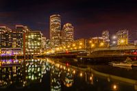Vanaf de Harborwalk in Boston zijn er veel mooie uitzichten over de stad en het havengebied. Hier kunt u de wolkenkrabbers van het financiële district en de Seaport Boulevard Bridge 's nachts zien.