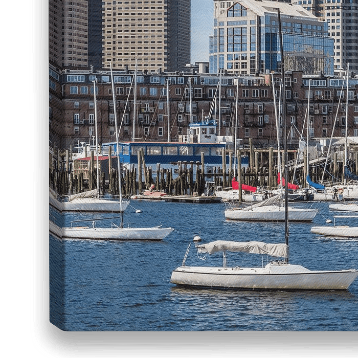 Een boottocht voor de kust van Boston. Een idyllisch uitzicht op de skyline van North End met de Custom House Tower en de moderne wolkenkrabbers van het financiële district.