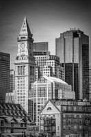 Een klassieke zwart-wit uitzicht op de skyline van de North End met de Custom House Tower en de moderne wolkenkrabbers van het financiële district.