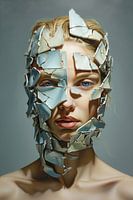 Het gezicht van een vrouw bedekt met gebroken scherven. De scherven maken zich los van het gezicht en de ware persoon, het ware zelf komt tevoorschijn. Surrealistische voorstelling.