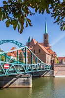 Wroclaw is de vierde stad van Polen en de hoofdstad van Neder-Silezië. Het is de culturele hoofdstad van Europa in 2016. Hier is een uitzicht vanaf Wyspa Piasek op de Collegiale Kerk van het Heilige Kruis en St Bartholomeus. Links is de Most Tumski Kathedraalbrug.