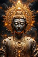 Een majestueuze Boeddha verrijst in de gloed van eeuwig licht, omgeven door een gouden stralenkrans die schittert als een universum van energie en harmonie. Zijn gezicht straalt volmaakte rust uit, zijn gestalte ademt een bovenaardse balans.