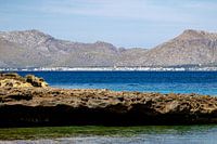 Panoramisch uitzicht op het kustlandschap voor het schiereiland La Victoria op Mallorca met bergketen op de achtergrond en rotsen in het water op de voorgrond