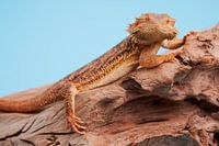 Studioportret van een baardagaam tegen blauwe achtergrond, zittend op een houten boomstam