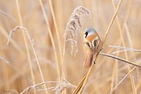 Baardmannetje in de ochtend met het rijp nog op het riet