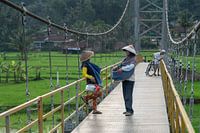 Twee Javaanse vrouwen voeren een gesprek op een wandelbrug, terwijl ze het blijkbaar over de verkoop en hun handel hebben.