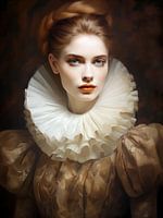 Portret van een jonge vrouw met rood opgestoken haar in een goudkleurige zijden jurk met een grote dubbele plooikraag.