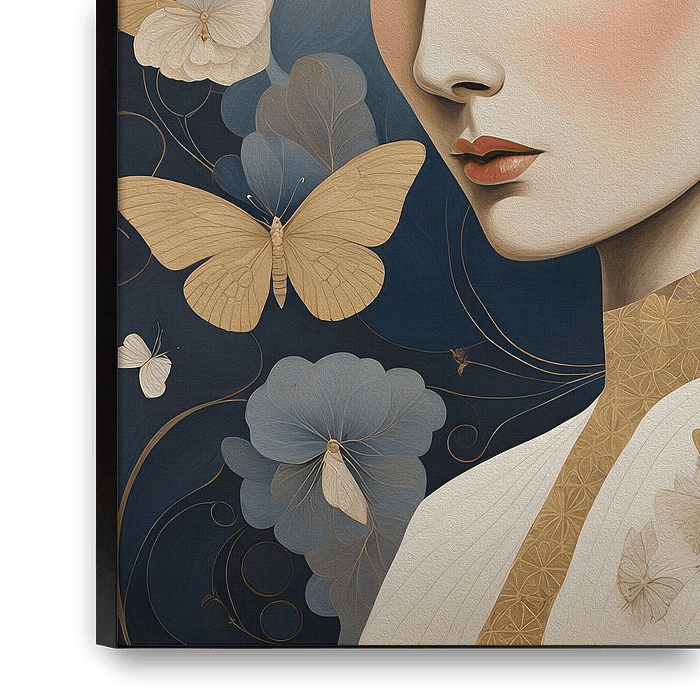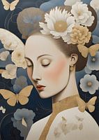 Dit opvallende kunstwerk, ontworpen als eyecatcher voor je huis, toont een elegant portret van een vrouw verweven met boeiende geometrische vormen en kleurrijke bloemen. Haar gelaatstrekken worden benadrukt door de strakke lijnen en vormen om haar heen, terwijl de bloemen een zachte en organische touch toevoegen aan het geheel. De…