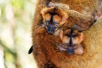 Prachtige opname van 2 baby Maki's (lemuren) van de soort Eulemur rufifrons in een natuurpark in Madagaskar