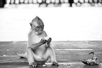Dit lieve, kleine aapje was banaantjes aan het eten, die door de mensen in het apenpark werd gekocht om ze aan hen te voeren. Dit speelde zich af in the Monkey Forest op Bali.