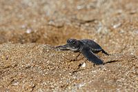 Deze baby schildpad kroop net uit het ei op weg naar de open zee. De foto is genomen op een strand van de Galapagos eilanden.
