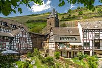 Vakwerkhuizen in Malerwinkel en stadspoort Steeger Tor in Bacharach, werelderfgoed Obermittelrheintal, Rijnland-Palts, Duitsland Vakwerkhuizen en stadspoort Steeger Tor in Bacharach, werelderfgoed Obermittelrheintal, Rijnland-Palts, Duitsland