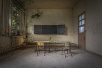 In een oud schoolgebouw staat in één leslokaal nog 2 tafeltjes met 2 stoeltjes. Door dat ramen kapot zijn neemt de natuur bezit van het lokaal.