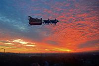 im Himmel werden Plätzchen gebacken. Fotomontage eines Rentierschlittens mit Sonnenuntergangswolken