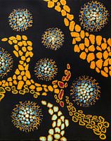 Backing Vocals. Organische vormen in felle maar toch warme kleuren, met een randje van goud. Backing Vocals, vormt samen met Golden Crane een tweetal schilderijen die bij elkaar horen. Ook wel een tweeluik of pendanten genoemd. De vormen lopen in elkaar over.