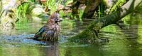Een (Vlaamse) Gaai betrapt tijdens het badderen. Hij had niets door dat we een paar meter verder in de bosjes stonden. Geweldig moment. Gemaakt op het park De Hoge Veluwe.