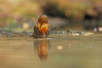 Roodborst met zijn spiegelbeeld. Op een van de eerste warmere dagen van het voorjaar kwam deze een lekker bad nemen. De roodborst of het roodborstje (Erithacus rubecula) is een zangvogel uit de familie Muscicapidae (vliegenvangers). Hij waagt zich dicht bij huizen, vooral 's winters. Verder is het een zeer talrijke broedvogel van grote…