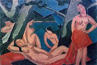 Vijf vrouwen, baadsters bevinden zich in de natuur, in het bos bij een open water. Een vrouw ligt languit naakt op de grond en het naaktmodel poseert daarbij haar benen, buik, torso en borsten op het naaktportret. Rechts staat een meid topless met een rode handdoek voor haar lichaam.