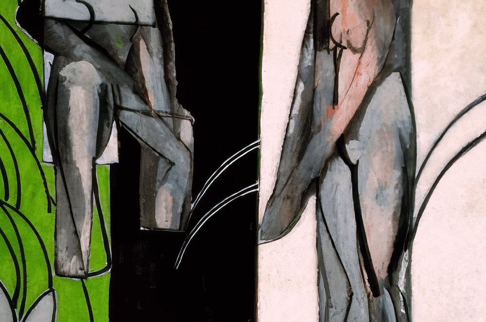 De menselijke figuren zijn zeer gestileerd weergegeven, met langgerekte ledematen en vereenvoudigde gelaatstrekken. Hun lichamen zijn gereduceerd tot geometrische basisvormen en rondingen, geschilderd in gedempte grijstinten en vleestinten. De gezichten van de figuren zijn ofwel blanco of slechts gesuggereerd, wat de nadruk legt op de vorm en niet op de individuele identiteit.