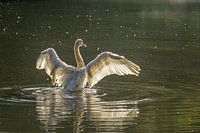 Een portret van een badende zwaan met gespreide vleugels. Dit portret heb ik in de Cranenweyer te Kerkrade tijdens een prachtige sfeervolle zonsopkomst gemaakt.