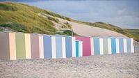 Een rij kleurrijke badhuizen in het laatste avondlicht.