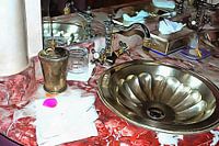 Deze beelden tonen een deel van een Marokkaanse badkamer in Marrakesh met een zilveren wastafel in marmer. Sierlijke zilveren armaturen en fittingen in overvloed. Het toppunt van luxe! En let op het rozenblaadje op de handdoek.