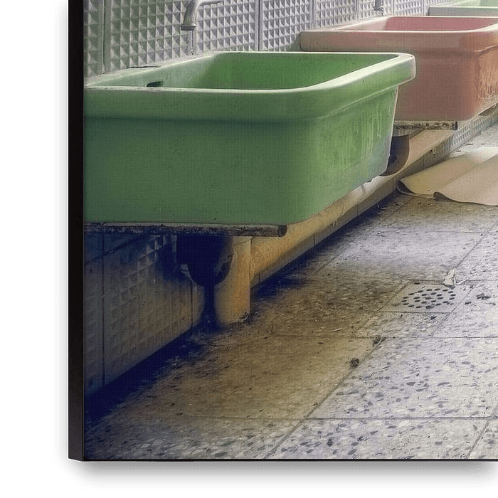 Koop dit stilleven Badkamer voor Kinderen in Verlaten Jeugdhuis. van Roman Robroek - Foto's van Verlaten Gebouwen op canvas, aluminium dibond, (ingelijste) fotoprint, behang en ArtFrame, op maat geprint in Fine-Art kwaliteit.