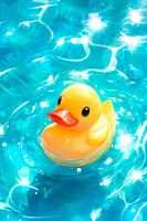Een vrolijk gezicht: Een knalgele badeend drijft zachtjes op het glinsterende blauwe water. De zonnestralen reflecteren levendig, terwijl het gladde oppervlak zachte golven vormt. De heldere ogen en rode snavel van de eend geven de afbeelding een speelse, uitnodigende sfeer die direct een goed humeur verspreidt.