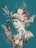 Grieks mannenbeeld met bloemen op blauwe achtergrond
