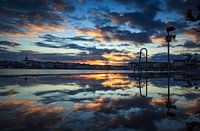 Winterse zonsondergang weerspiegeld in een plas op de beroemde pier Bains des Paquis in Geneva. Switzerland.
