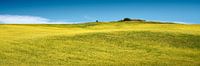De witte bank op de top staat eenzaam en vormt een mooi contrast met de gele koolzaadvelden.