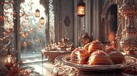 Heerlijke stukken baklava, stijlvol geserveerd op een zilveren dienblad, vangen de feestelijke sfeer van de Ramadan in een prachtig oosters paleis. Zonlicht stroomt door de sierlijke ramen en baadt het tafereel in een warm, uitnodigend licht.
