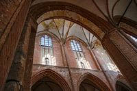 Bakstenen gewelf met ramen, bogen en pilaren in de St. Georgenkerk in het oude centrum van Wismar, beroemde toeristische trekpleister