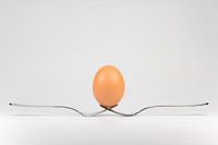 Conceptuele foto van een balancerend ei op twee ingetande metalen vorken te gebruiken als achtergrondfoto of ter versterking van het concept balans, risico, balanceren en dergelijke.