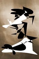 Een grafische illustratie in zwart-wit op een sepia achtergrond. Ronde vlakken, rechte lijnen. Abstract digitaal kunstwerk.