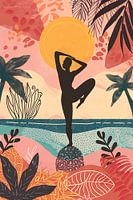 "Balans bij Dageraad" toont een sereen moment waarin een yogi in perfecte harmonie met de omgeving een pose aanneemt. De opkomende zon vult de scène met warme tinten van roze en oranje, terwijl de natuurlijke omgeving – van tropische planten tot de kalme zee – de schoonheid van het ochtendgloren benadrukt. Dit kunstwerk straalt een…
