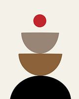 Digital art work met de titel: "Balans". Drie halve cirkels in aardetinten gestapeld met daarop een hele rode cirkel zwevend. Minimalistich zen.