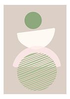 Geometrische vormen in pastelkleuren, balancerend op elkaar. In beige, groen, wit en roze.