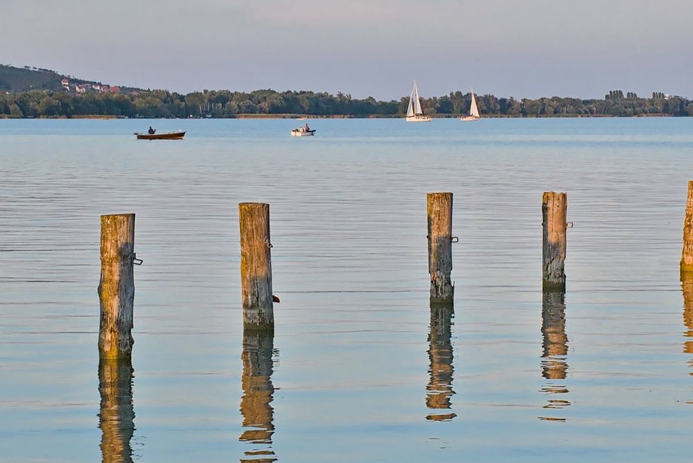 Romantische foto van het Balatonmeer, een ideale vakantiebestemming, in warm avondlicht, met houten palen die reflecteren in het water. Op de achtergrond zeilboten en de heuvels van Keszthely, Hongarije