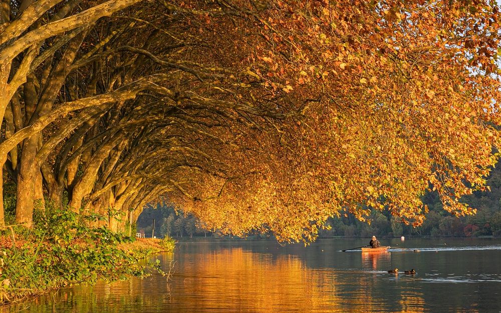 Platanenlaan aan het Baldeney-meer in herfstkleuren, Essen, Noordrijn-Westfalen, Duitsland