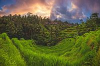 Prachtig tafereel op een van de vele rijstterrassen in en rond Ubud. Hier als panoramafoto in de avond met een dramatische lucht.