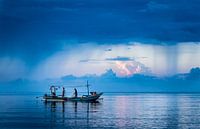 Bali, een van de prachtige eilanden van Indonesië, altijd mooi weer, het eten is er heerlijk, en hele vriendelijke mensen. Op zee zijn vissers op hun boot bezig hun netten uit te gooien, de vis wordt tijdens zonsondergang gevangen. Een zware regenbui op de achtergrond geeft een mooie sfeer aan de foto. De lucht kleurt van diepblauw tot roze door de ondergaande zon. Bali.... dat is toch alleen maar genieten!