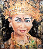 Danseres van het eiland Bali die tijdens de opvoering wordt geleidt door gamelanmuziek