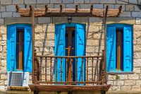 Deze foto met een oud balkon, deur en ramen is gemaakt in de plaats Ormos Marathokampos op Samos, Griekenland.