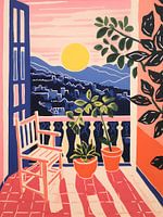 Betreed een zonovergoten wereld met dit digitale kunstwerk dat het charmante uitzicht vanaf een balkon vangt, geïnspireerd door de levendige en kleurrijke esthetiek van Matisse. Elke penseelstreek belichaamt de warmte van de zomer, met een uitbarsting van kleuren die dansen op het canvas als een vrolijke viering van het leven. Dit kunstwerk weerspiegelt de levendige sfeer van een zomerse dag, waarbij het balkonuitzicht wordt omgetoverd tot een levendig kunstwerk.
