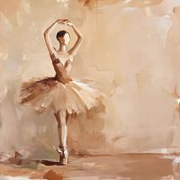 Een ballerina, modern uitgevoerd in warme aardetinten. Zachte schakeringen van beige en bruin vloeien in elkaar over en vangen de essentie van beweging en balans, zonder details te forceren. De vormen zijn subtiel en krachtig tegelijk: een ingetogen silhouet dat elegantie suggereert in plaats van verklaart.