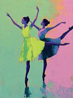 Ballerina Jurk | Dance Vibes - Dit dans schilderij toont twee elegante ballerina's, één in een levendige gele jurk en de ander in een subtiele groene jurk, beiden bewegend in een dynamische pose tegen een pastelachtergrond van groen en roze, wat een energieke en vrolijke sfeer oproept.