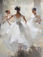 Gratie en beweging komen tot leven in deze elegante balletscène, die de schoonheid van de dans vastlegt in zachte, vloeiende penseelstreken. Een tijdloos kunstwerk dat elke binnenruimte een vleugje luchtigheid, verfijning en artistieke charme geeft.